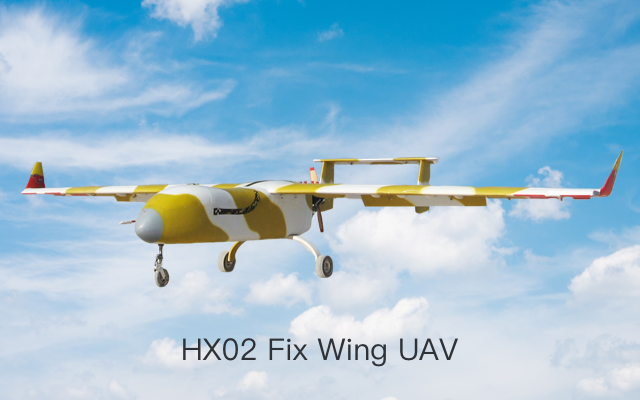 HX02 Fix Wing UAV features long endurance, large payload capacity and fewer crew staff. This UAV is capable of fully autonomous takeoff, flight and landing. Ground station receives UAV flight data real time and sends instructions so as to realize real time control and safe flight of the UAV during day time and in the night.