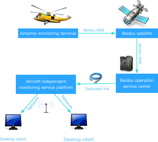 The Beidou-based aircraft independent monitoring (AIM) terminal, independent of aircrafts’ avionics system, is used for aircraft positioning and status monitoring and provides short text message communication between aircrafts and ground control. The AIM service platform and the Beidou Operation Service Center are interconnected. The airborne monitoring device transmits the real time position and status data of the aircrafts to ground control through Beidou SMS. The client obtains the real time status data of the aircraft and displays the position and corresponding status data on the digital map.
